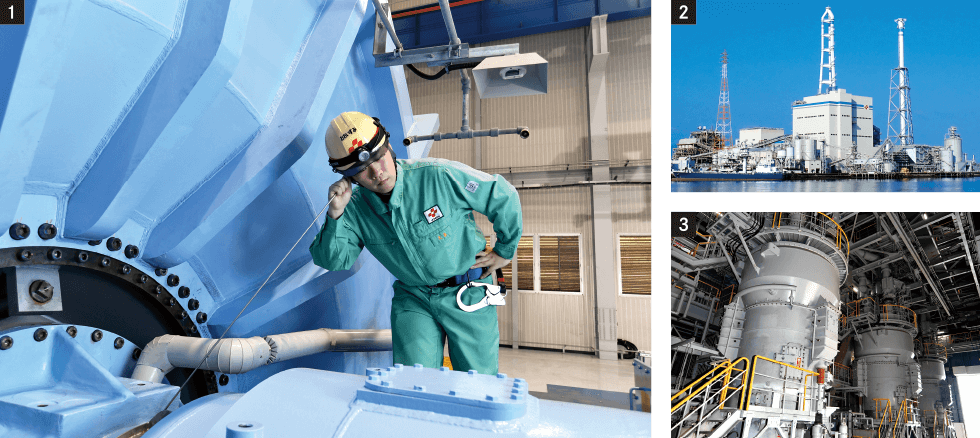 ①稼働中の新1号機で聴診棒を用い異常をチェックする大泉さん ②美しい瀬戸内海に調和する西条発電所(四国電力提供) ③石炭の効率的な燃焼を支える微粉炭機