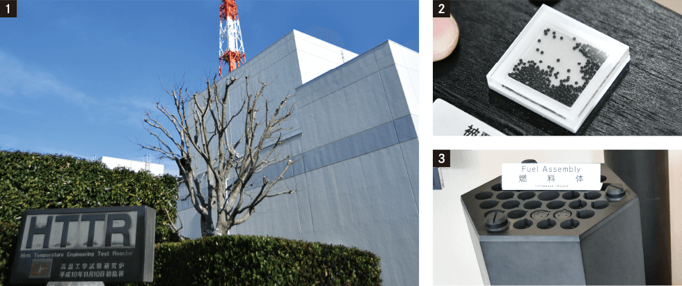 ①世界でも先端の高温ガス炉研究開発拠点「HTTR(高温工学試験研究炉)」②融点の高いセラミックなどで被覆され放射性物質の閉じ込め性能が高い、粒状の高温ガス炉向け燃料③燃料粒子を焼成した「燃料コンパクト」を、放射線に強く耐熱性が高い六角形の黒鉛ブロックにセットした「燃料体」