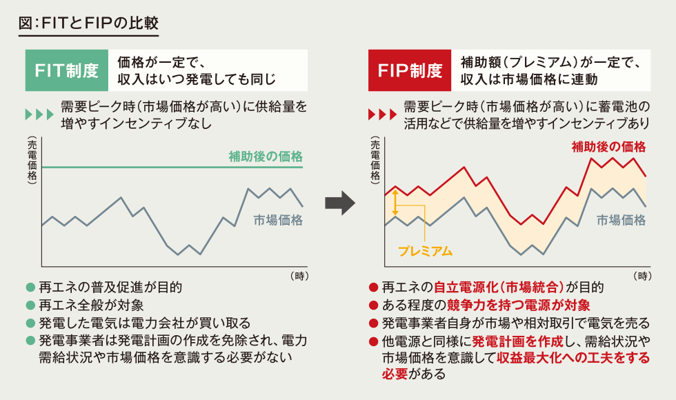 再生可能エネルギーはカーボンニュートラル時代の主力電源となることが期待されています。その実現には、再エネ自体を自立した産業へと成長させることが重要です。2022年4月から、従来のFIT(フィード・イン・タリフ)制度に加えて、主要な再エネの自立化を目的とした「FIP(フィード・イン・プレミアム)制度」が始まります。その概要を紹介します。