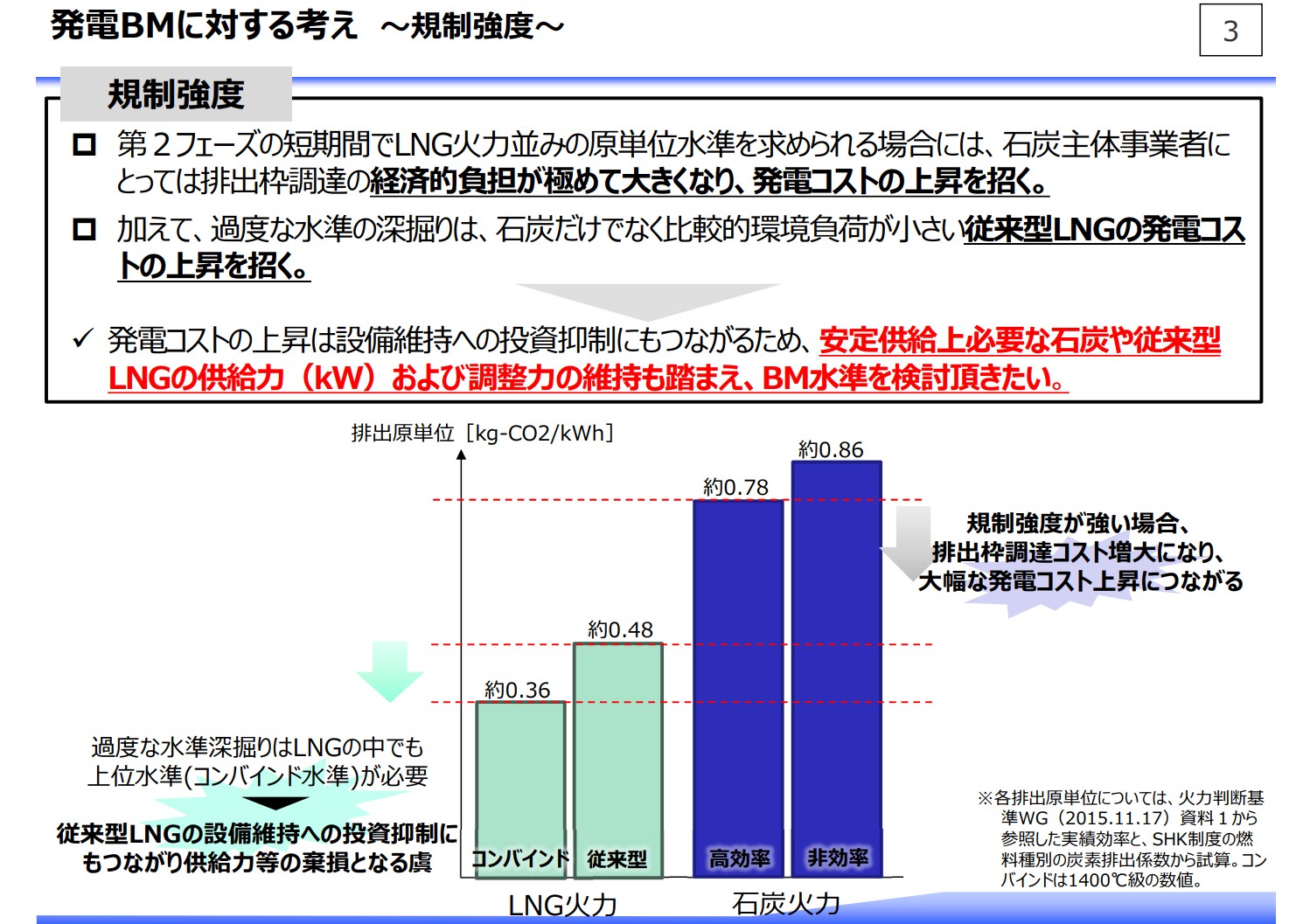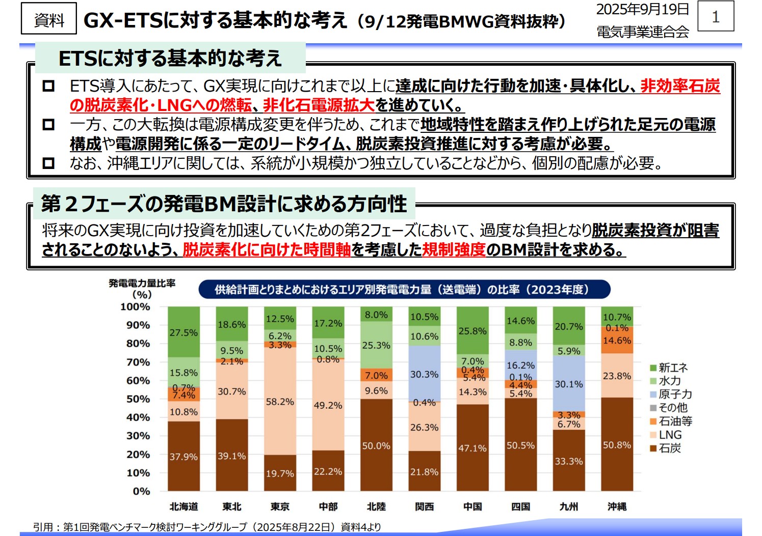 そのため、既存の火力電源構成を踏まえた排出削減策を模索する必要があり、例えば、第2フェーズ期間中は、燃種別でのベンチマーク設計により排出削減を促していく仕組みとして頂きたいと考えております。