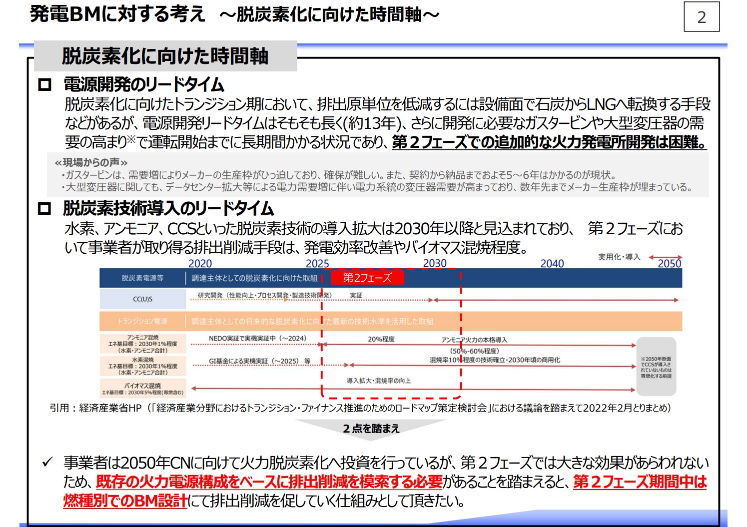 具体的に紹介しますので、2ページをご覧ください。脱炭素化に向けた時間軸には、主に2つの考慮すべき観点があります。1つが今申し上げた電源開発のリードタイムです。
