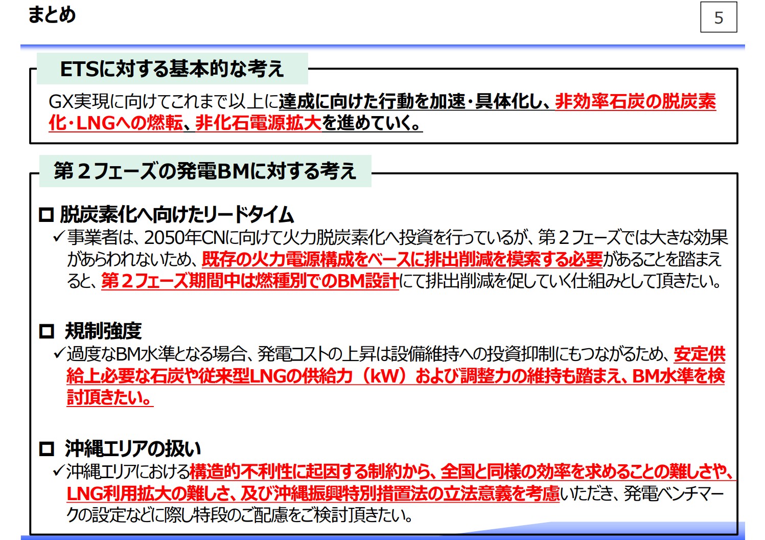 以上、ETS導入に向けた制度設計に対する個別の意見を述べさせていただきました。資料5ページのまとめの冒頭にも記載しましたが、我々電気事業者としましても、非効率石炭の脱炭素化やLNGへの燃料転換、非化石電源拡大を進めていきます。また、需要側でも電化の推進に取り組むことを通じて、GXの実現に貢献していきたいと考えています。