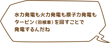 ウランが核分裂する熱エネルギーの力で水を蒸気に変えて、その蒸気の力でタービン(羽根車)を回して電気を作るんだ。